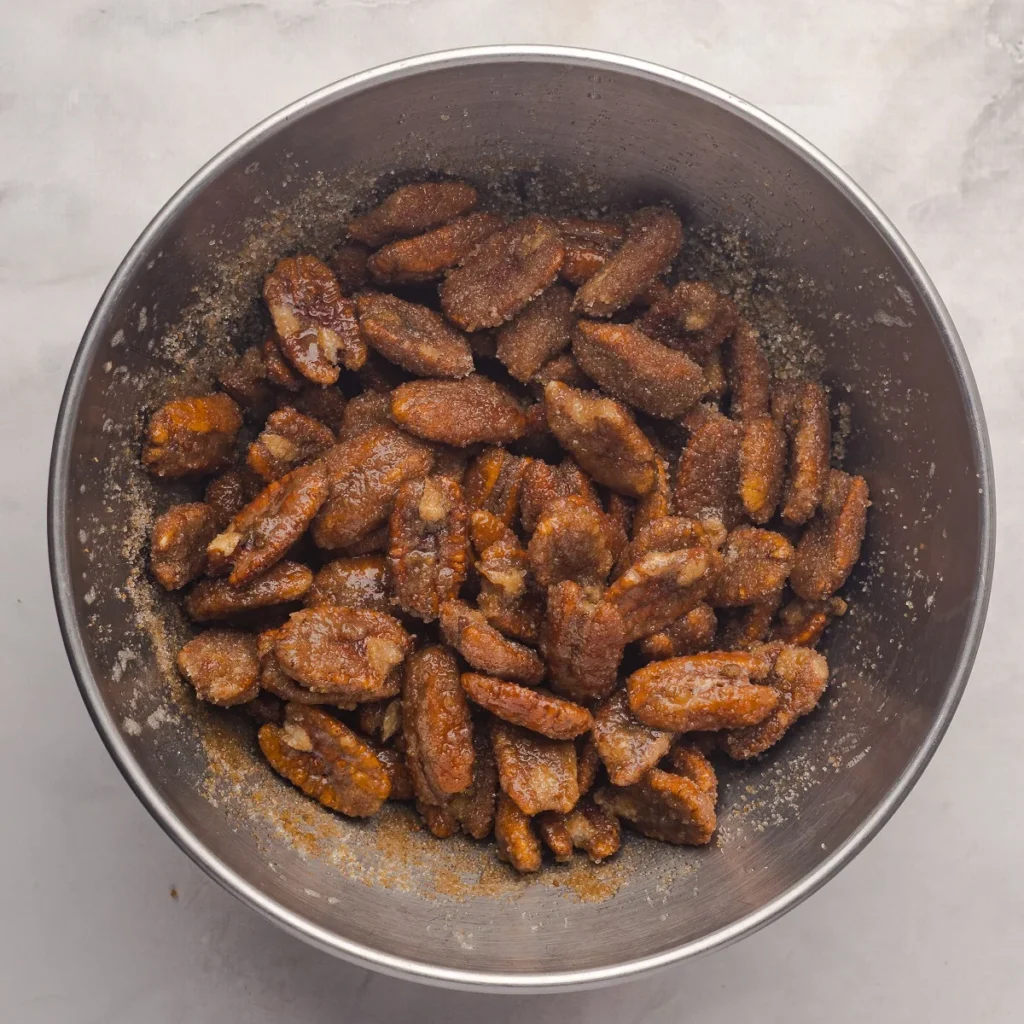 - Combine sugars, cinnamon, salt, and optional spices, and mix with the coated pecans until fully clumped.
