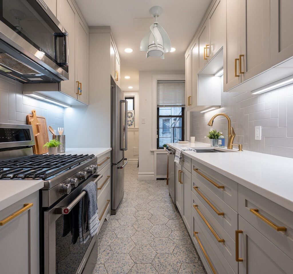 The galley-style kitchen, recently renovated, offers sleek modern finishes and high-end Kohler fixtures, providing the perfect balance between style and function. The kitchen features premium appliances, including a free-standing gas range, and ample storage space in its contemporary cabinetry. An eat-in spot at the end of the counter allows for casual dining, making the space as practical as it is beautiful.