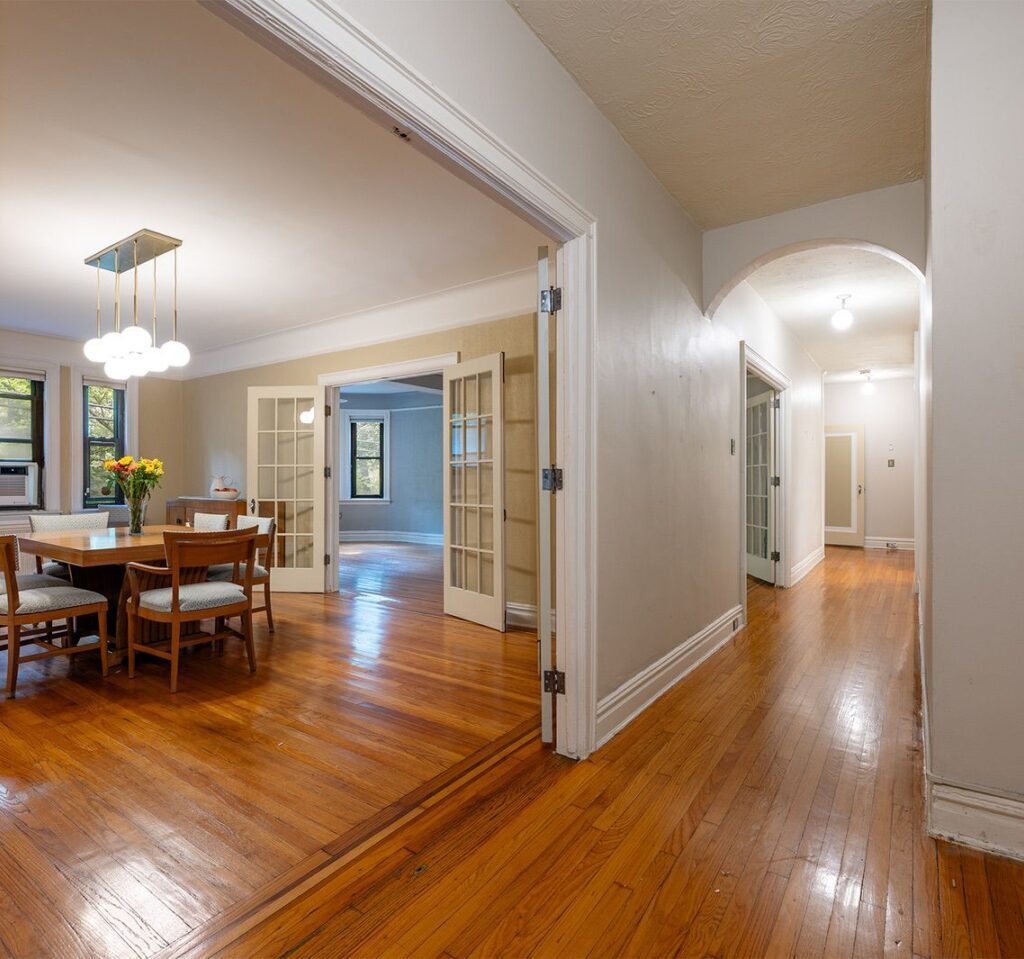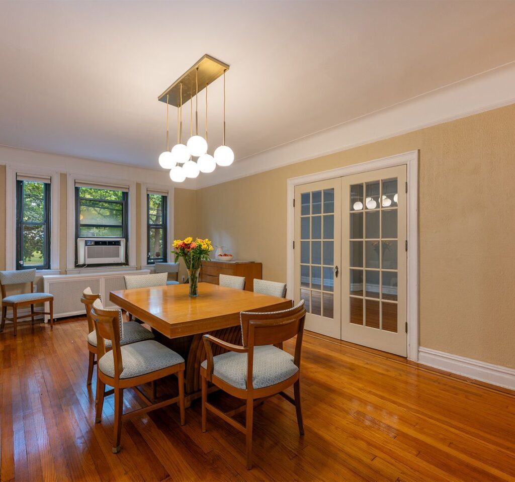 As you enter Unit A5, you’re immediately greeted by the condo’s original hardwood floors, which are complemented by 9-foot ceilings that enhance the sense of space. Natural light floods the expansive rooms through multiple windows, highlighting the beauty of the historic features. Sophisticated French doors with original hardware connect the rooms, adding to the home’s elegance. The formal dining room flows effortlessly into the spacious living room, which is highlighted by bay windows that provide southern exposure, offering serene views of Lincoln Park’s oak trees.