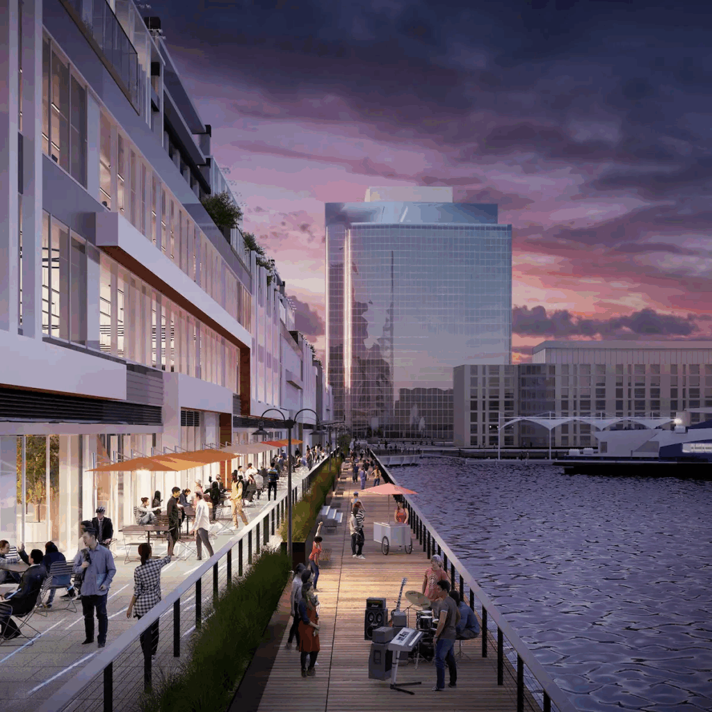The transformation extends beyond the building itself. A new road is planned just north of Harborside 8, bordering the remaining parking lot, along with a new lawn and plaza on the building’s east side, creating a more pedestrian-friendly and aesthetically pleasing environment.