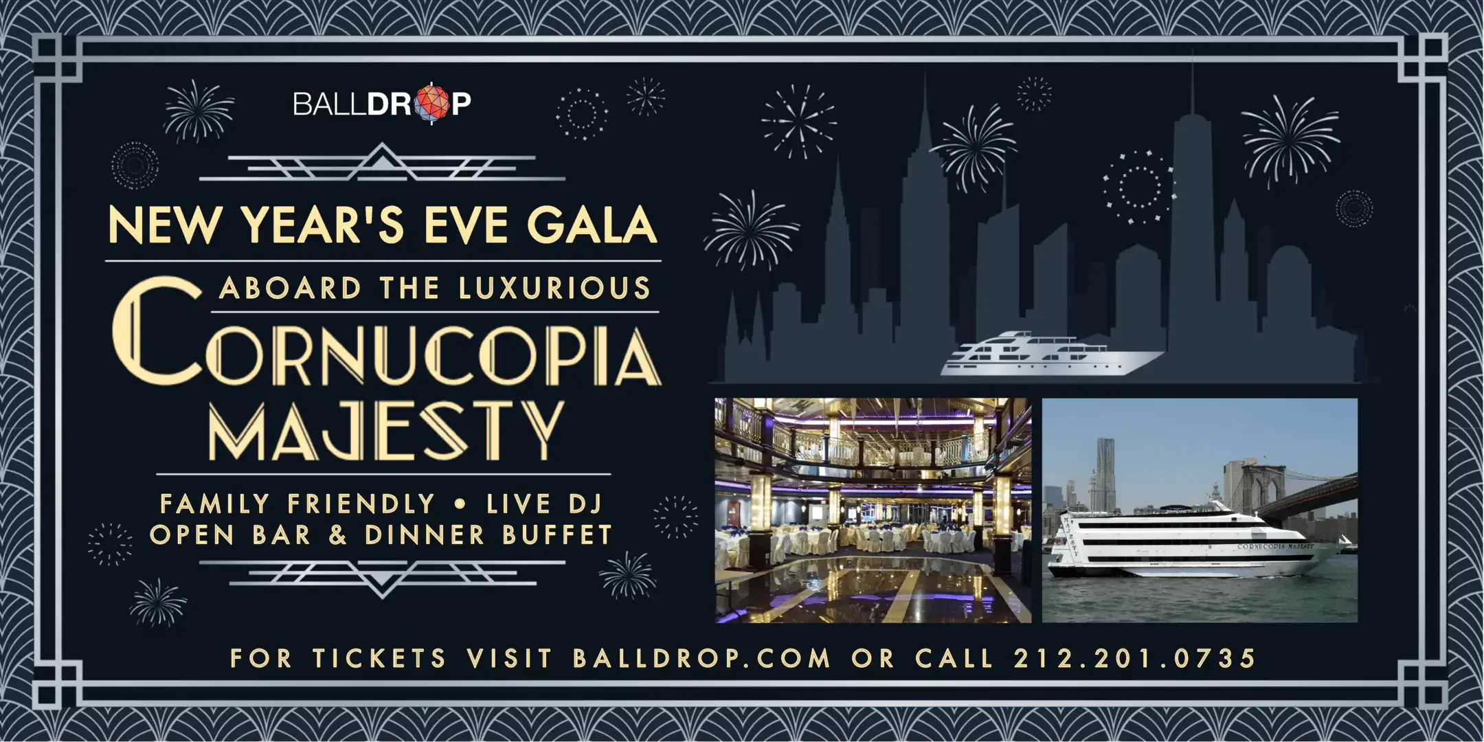 Cornucopia Cruise Line New Year’s Eve Gala – Hoboken. The Cornucopia Cruise Line departs from the 14th Street Pier in Hoboken for an adults-only gala. This event features a premium open bar, buffet dinner, and DJ-led entertainment with dancing throughout the evening. Party favors and a champagne toast at midnight add to the festive atmosphere. Guests must be 21 or older and carry a valid photo ID. Boarding starts at 8:00 p.m., and the cruise sails from 9:00 p.m. to 1:00 a.m., offering a lively, energetic way to celebrate the holiday on the water. Explore New Jersey’s restaurants section for other top dining destinations near Hoboken’s waterfront.