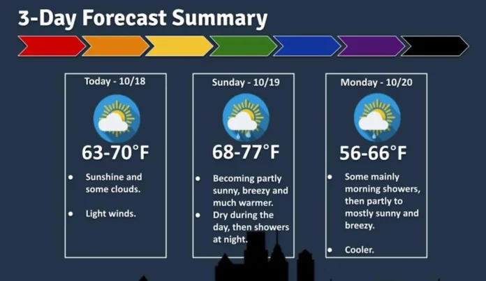 Saturday promises the sunniest conditions of the weekend, with highs climbing into the 65-70 degree range across most locations. The day will feature a pleasant mix of sun and clouds, and light winds from the west and southwest will make outdoor activities comfortable. Overnight, temperatures will dip into the 40s inland and remain slightly warmer near the coast, in the 50-55 range, creating another crisp but manageable autumn night. This will be the ideal day for farmers, hikers, and residents looking to enjoy outdoor fall activities.