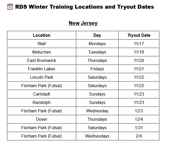 RDS Winter Tryouts will be hosted at multiple New Jersey locations, providing convenient access for families throughout the state. Sessions will take place at Wall, Metuchen, East Brunswick, Franklin Lakes, Lincoln Park, Florham Park, Carlstadt, Randolph, and Dover. Futsal sessions in Florham Park will also provide specialized indoor training to improve ball control and quick decision-making in tight spaces — an essential skill for modern soccer players.