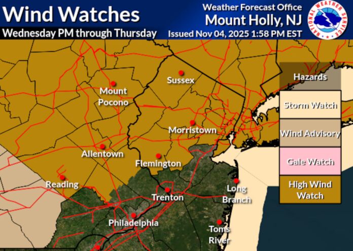 The National Weather Service has already issued high wind watches for many counties north and west of the New Jersey Turnpike. Motorists driving high-profile vehicles should use extra caution on open roadways, especially on bridges and elevated highways, where crosswinds may be more pronounced. Tree limbs weakened by recent weather could come down, and sporadic power outages are possible in a few spots.