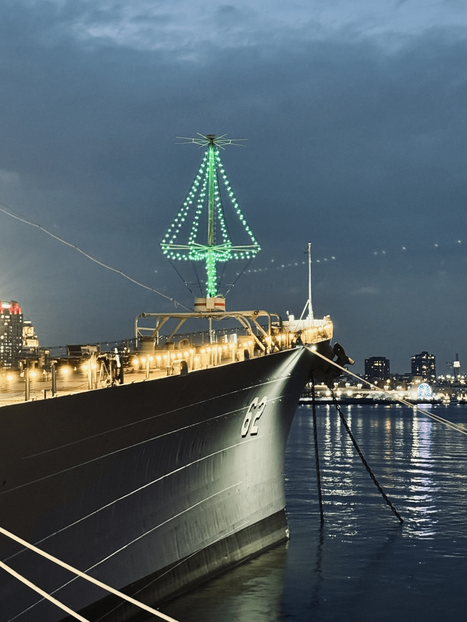 The ship’s historic spaces are adorned with beautifully decorated Christmas trees, each crafted by local nonprofits, highlighting South Jersey’s community spirit and creative flair. Guests visiting during the season can enjoy these sparkling displays, stroll through the ship’s corridors lit with holiday lights, and take in spectacular New Year’s Eve fireworks over the Delaware River, creating a perfect mix of maritime heritage and festive celebration.